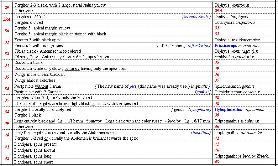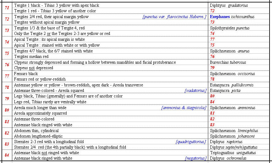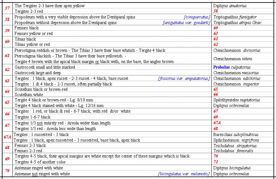 --- All these references (PDF) are on Internet, except : Constantineanu 1959 & Valemberg 1983 ---- Also consult : Taxapad : http://www.taxapad.com/local.php Faunaitalaia : http://www.faunaitalia.it ----------- Townes published the generic keys of Ichneumonidae of World except (due to the lack of sponsors) those of Ichneumoninae. The current general keys of Ichneumoninae follow (to my knowledge ...) those of Schmiedeknecht, it is the case for Constantineanu & Valemberg, but not for Berthoumieu. The key, which I present you here, are the fruit of the translation of those of Constantineanu because this author describes rather completely the Insects, I completed with Schmiedeknecht. Taxapad and Faunaitalia allowed me to find the other species absent otherwise, on this subject there are some differences between these 2 sites as for the presence of the species in Italy and their generic classification. ----------- Is not either included in the key : - Diphyus sexzonatus Rudow 1888 (Known only in Sicily), because the description of author don't allow me to integrate the species. - Diphyus efferus Wesmael 1854, because I did not find the description of ♀ (Who is maybe unknown ?). - Diphyus macilentus Berthoumieu 1898, because I did not find the description of ♀ (Who is maybe unknown ?). ----------- Identification of Ichneumonidae. [The photos, of 2 species quoted in this paragraph, are at the beginning of the "aggiungi files"] * The 1st difficulty is the distinction between ♂ & ♀, it is needed to have one very good binocular for examine the ventral apex of the insect (even some specialists have difficulty). * The 2nd difficulty is the lack of stability of colors :