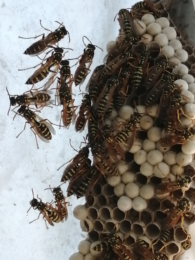 Purtroppo non ho avuto il coraggio di avvicinarmi di più per scattare una foto più dettagliata di un singolo individuo, perchè con queste vespe io devo convivere almeno un altro mese o due, visto che hanno fatto il nido nella serra dove coltivo peperoni e melanzane! E se mi percepiscono come elmento di disturbo, non potrei più avventurarmi nemmeno ad annaffiare le piante...