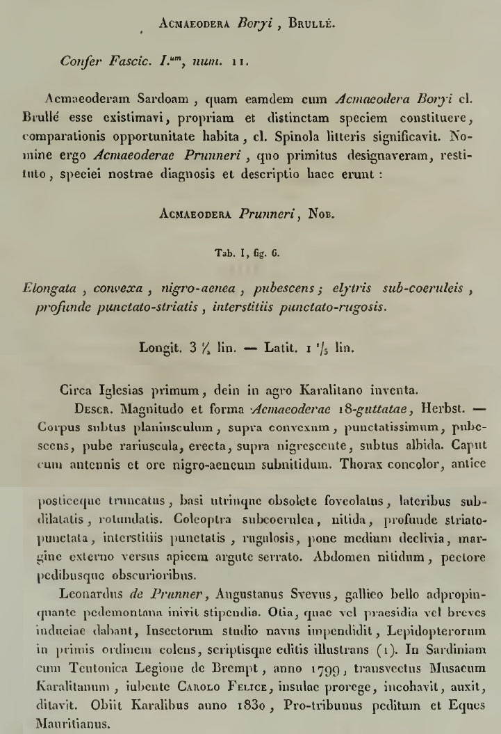 Dunque, Gené nel 1836, cita questo taxon come Acmaeodera boryi Brullé, ma nelle osservazioni già riporta il nome prunneri: (mi è poco chiaro però il contesto e qui avrei bisogno del vostro aiuto).