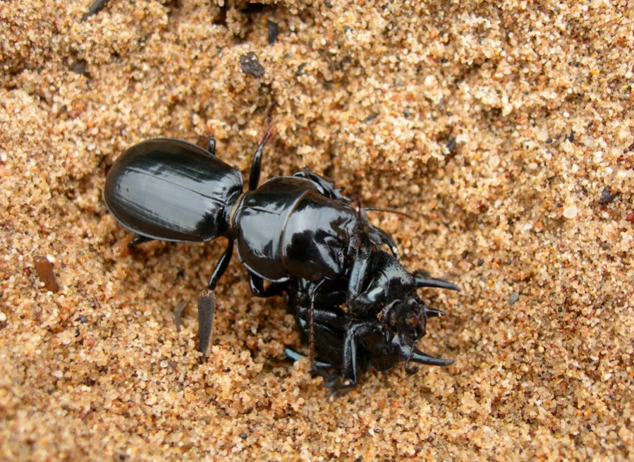 Ciao a tutti. Non so se questa sia la sezione del forum più adatta per presentare questo argomento, comunque… Due giorni fa ho fatto un giro tra Marina di Arbus e la foce del Rio Piscinas (Sardegna sud-occidentale, provincia del Medio Campidano). Girando tra le dune sabbiose ma già in parte consolidate, che si estendono nell’entroterra per diverse centinaia di metri mi sono imbattuto in una scena alquanto terrificante: il combattimento all’ultimo sangue tra due grossi e splendidi coleotteri. I protagonisti sono il Carabide Scarites (Scallophorites) buparius (Förster, 1771) e il Geotrupidae Chelotrupes hiostius (Gené, 1836). Il primo è un grande e possente cacciatore, il secondo un massiccio ma pacifico stercorario. La scena mi ha fatto pensare ad un combattimento tra un tirannosauro e un triceratopo. L’incontro è probabilmente fortuito: lo Scarites vede il Chelotrupes solo quando gli passa a breve distanza Da questo momento la sorte del Chelotrupes è praticamente segnata: lo Scarites, molto più rapido, lo ghermisce con le robustissime mandibole, cercando un punto debole nell’armatura della sua preda