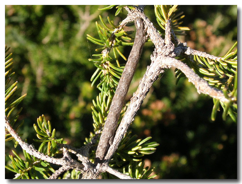 Si tratta appunto di un bruco di un Lepidottero Geometride, probabilmente Athroolopha chrysitaria, mimetizzato fra i rami di Erica.