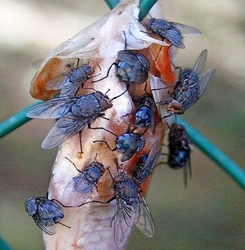 Più che carne mi sembra un pesce. Le mosche sono delle Calliphora vicina maschi e femmine. |