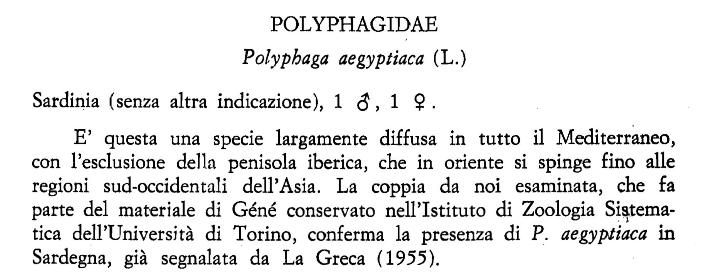 Quel lavoro di La Greca non lo posseggo e nemmeno conosco dove scrive che gli esemplari di Polyphaga aegiptiaca raccolti in Sardegna li abbia dati a Géné.