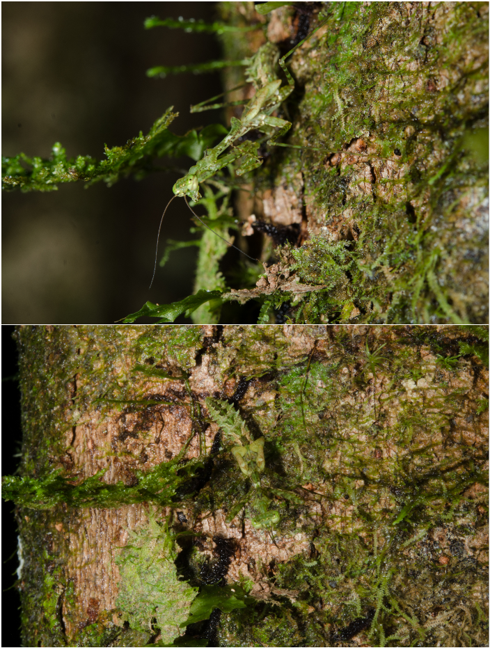 È appena uscita la descrizione di questo nuovo genere e nuova specie, pubblicata sui Quaderni della Società per gli Studi Naturalistici della Romagna. Ho inserito il PDF qui. Microsibylla sechii è una specie molto particolare, che sembra porsi come sister taxon di tutti gli altri Sibyllinae noti per via di alcuni caratteri decisamente plesiomorfici. Tuttavia mostra anche numerose apomorfie, sviluppate per il particolare stile di vita che sembra condurre. Pare infatti che questa specie viva sui tronchi coperti da muschi e felici epifite. Per questo motivo ha sviluppato alcuni adattamenti per muoversi e mimetizzarsi in tale ambiente. Credo che le foto in natura di Ehoarn Bidault siano esplicative di quanto questa specie sia adattata al suo micro-habitat. Tra l'altro dovrebbe essere il primo caso di un simile stile di vita in un Mantodeo africano, mentre altre specie "moss-dwelling" erano note per il Neotropico e per l'Asia tropicale. La specie è dedicata a Daniele Sechi, che ne ha raccolto l'olotipo. Questo è l'olotipo maschio, fotografato da Augusto Degiovanni. Mentre questo è un giovane maschio (sub-adulto), fotografato in natura da Ehoarn Bidault. Marco