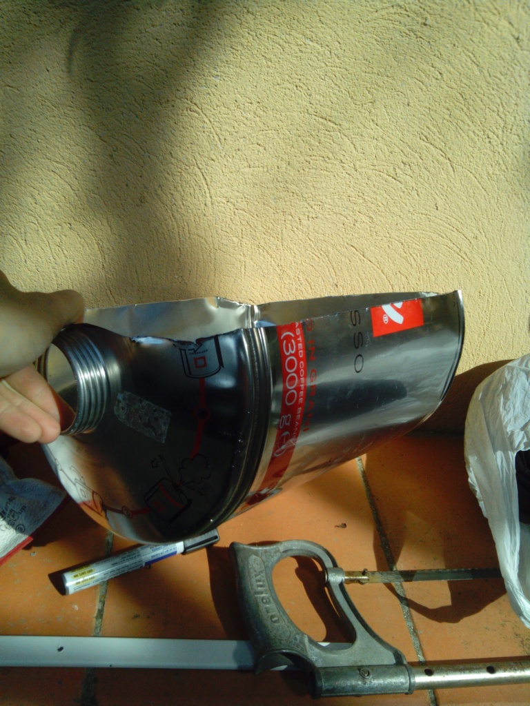Da poco un amico mi ha regalato un contenitore particolare, in acciaio. Conteneva caffè in grani di una nota marca. Il contenitore viene montato nelle macchine da bar che macinano al momento il caffè, ma una volta vuoto può essere utilizzato per diversi scopi: nel mio caso una trappola luminosa: Volevo realizzare un qualcosa che potesse rendere maggiormente catturante la fonte luminosa, intercettando e convogliando gli insetti in maniera funzionale: per prima cosa con un pennarello si segna la linea di taglio, in modo che dal contenitore cilindrico si ottenga una sezione longitudinale. L'operazione può essere fatta con un piccolo smeriglio o con una robusta cesoia da lamiera: superfluo (ma non troppo) dire che oltre agli occhiali protettivi sono fondamentali buoni guanti in pelle: i bordi del metallo appena tagliato sono affilati come rasoi. Ecco cosa si ottiene: Successivamente si limano con cura i margini tagliati, in modo che siano inoffensivi per le nostre dita. Poi si verifica il montaggio del contenitore che conterrà il liquido conservante (acqua salata o aceto). Fortunatamente ne ho trovato uno che va a fagiolo con la filettatura del contenitore metallico. Poi si realizza un foro nella parte alta, necessario ad appendere la trappola e al passaggio del filo elettrico. Il punto dove realizzare il foro va cercato in modo che la trappola appesa risulti ben bilanciata. Poi si monta il cavo e il portalampada. Possiamo anche "gommare" i bordi del metallo tagliato perché anche se limati risultano comunque affilati. Basta prendere un normalissimo tubetto da impianti idrici, tagliarlo lungo la lunghezza e fissarlo ai bordi. La trappola è pronta. Può essere alimentata o con corrente di rete oppure con il solito sistema batteria 12V-inverter che avevo usato qui. Occorre sicuramente fissarla ai lati con due pezzi di spago in modo che il vento non la faccia ondeggiare. La settimana prossima la proverò per testarla: