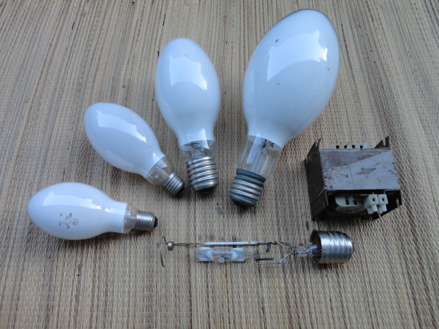 1) Nella prima foto vengono esposte, lampade a vapore di mercurio di potenze comprese fra 400 wat e 50 wat con una da 250 wat non schermata e relativo reattore... queste lampade con una relativa potenza d'emissione e brillantezza trovano buona valenza d'impiego per la loro posizione di funzionamento universale, costo e praticita' necessitando solo del reattore e in caso di applicazione con G.E sono consigliati ma non obbligatori i condensatori di rifasamento.