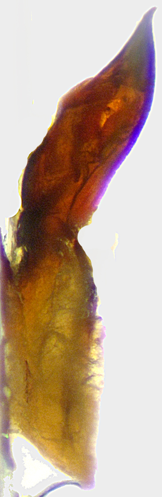 Allora, ho preso un cartellino di acetato trasparente e l'ho inciso in un lato piegandolo a L poi ho messo una gocci di euparal e posto disteso l'edeago in maniera che la versione frontale si abbia nel lato colto della L. Ecco le foto veloci delle 3 angolazioni.