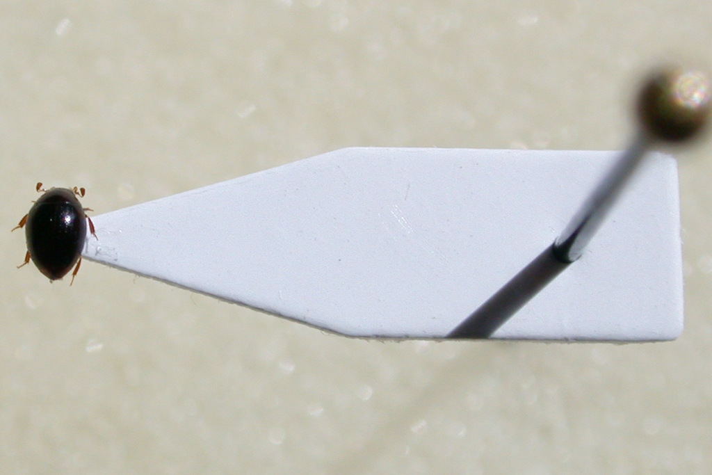 Spesso hanno la punta piegata in basso e ad arco, in modo che possa aderire ad almeno metà del ventre, su tutta la superficie. Ma questo dipende anche dalla forma del ventre dei vari insetti. Per esempio, quando ci incollano gli Agrilus, che sono ventralmente molto convessi, i cartellini hanno la punta molto piegata. Con quelli dal ventre piatto, come quelli dei tuoi esempi, non è necessario, ovviamente.