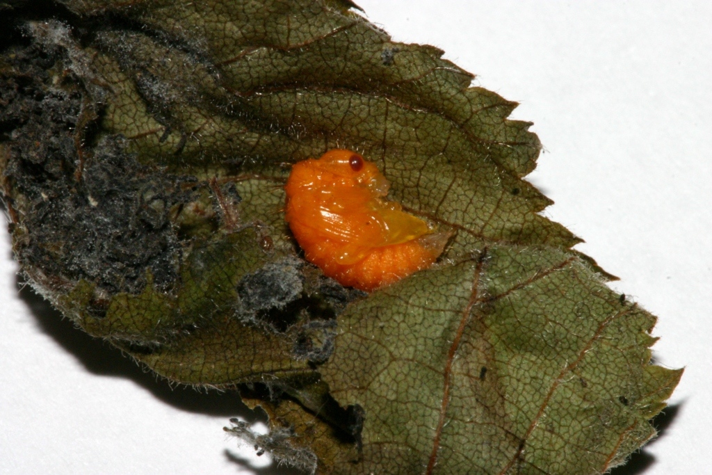 Osservate, in secondo piano, le tipiche tracce di alimentazione, che rispettano le nervature.