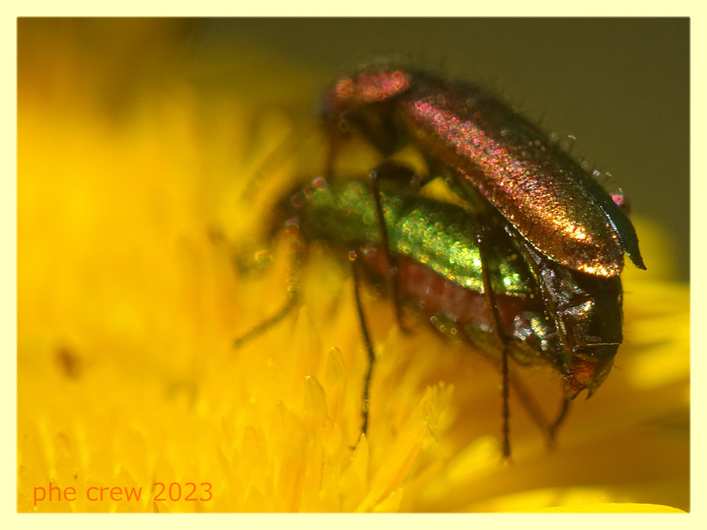 ...una bella coppia di Psilothrix aureola, si riconosce per le setole irte e rade e il pigidio a forma di U (visibile nel maschio Bordeaux).