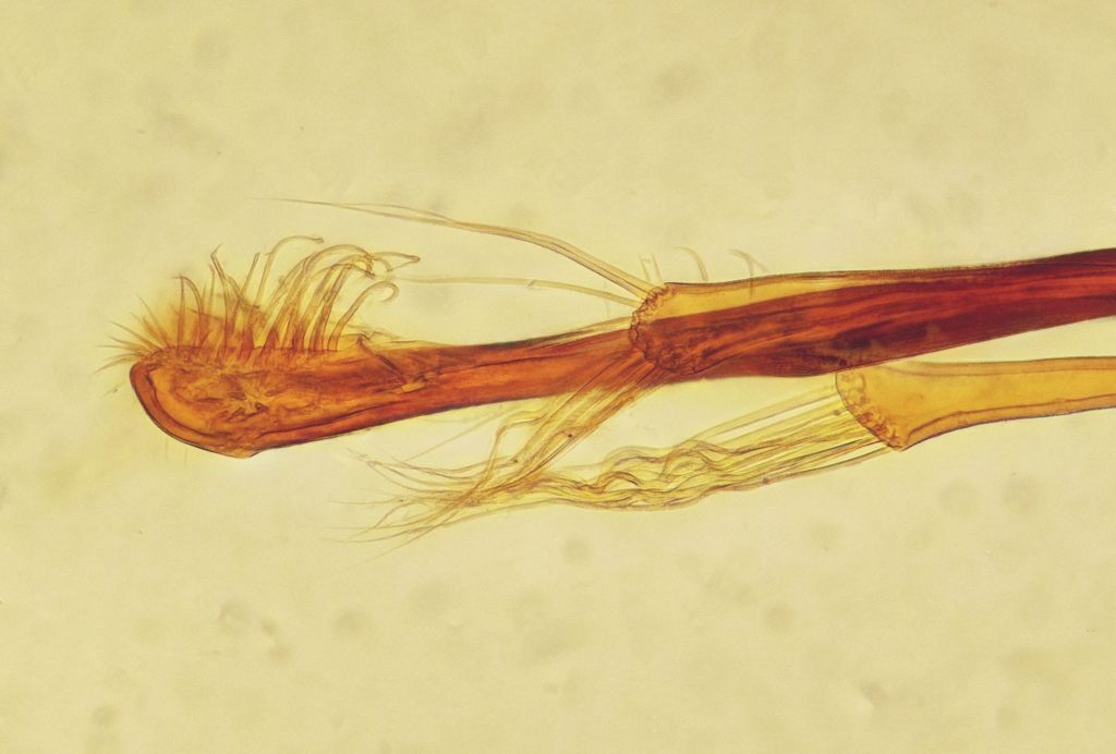 Ingrandimento dell'apice dell'edeago e dei parameri, le setole sono davvero particolari: