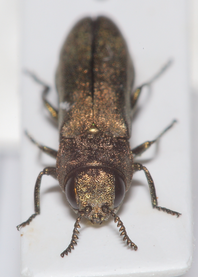 Julodis ha scritto: Infatti delle misure c'è poco da fidarsi. Sono troppo variabili, soprattutto tra gli xilofagi. Basta che il legno secchi un po' troppo rapidamente o che vari qualche altro parametro ed ecco che crescono meno del normale. Oppure, al contrario, può capitare che per qualche motivo impieghino un anno in più nello sviluppo, e magari escono degli adulti "giganti" (si fa per dire). Comunque io continuo a dire che per me questo è un Agrilus paganettii, non comune endemismo italiano. Visto che però gli Agrilus mi mettono spesso in crisi, specie da foto, vorrei sentire il parere di qualche altro specialista. E' venuto il dubbio anche a me, ma...le foto in orizzontale mi mettono un po in crisi; salvo che non sia un effetto della foto, mi appare troppo ramato e risulta alquanto appiattito il pronoto e la fronte. Certo per quanto attiene alla taglia è un po grande per l'hyperici. Non so... forse avendo un'altra foto magari in verticale e con i caratteri più evidenti...altrimenti lascio a voi la sentenza. |