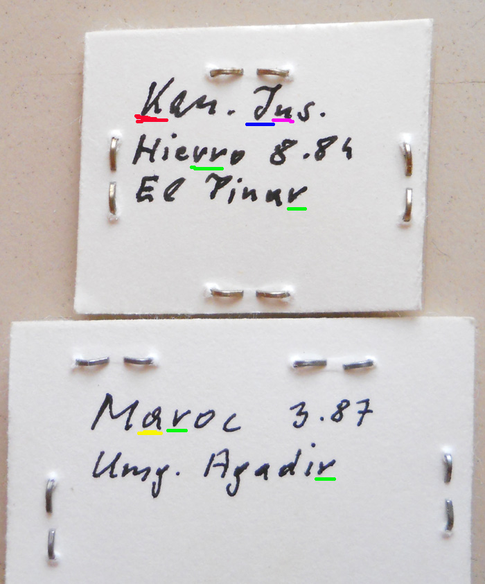 Tenebrio ha scritto: Daniele Maccapani ha scritto: Questa conteneva due Xylotrechus antilope... L’allegato cart xyloth.jpg non è disponibile Quell'YU indica una qualche provincia?    E soprattutto... Quel 7.80... Cos'è, luglio 1980??    Anche qua macherebbe il legit... Qualcuno la riconosce come propria? Sono ragionevolmente sicuro che la scrittura è di Peter Schurmann, compianto specialista di cerambicidi, che con ogni probabilità è anche autore del reperto. Sicuramente Gianfranco Sama lo potrà confermare.  Ho ritrovato due bustine di Peter Schurmann e metto la foto vicino alla tua dell'Istria: Ho evidenziato con lo stesso colore alcune lettere uguali: non c'è bisogno di essere dei periti calligrafi per avere la certezza che sono state scritte dalla stessa persona; anche la data è scritta in modo simile. Probabilmente i tuoi esemplari sono stati raccolti dallo stesso Peter Schurmann, tuttavia, in mancanza di questa certezza, potresti scrivere sui cartellini "ex coll. Peter Schurmann" che è sicuramente esatto.    Ciao Piero