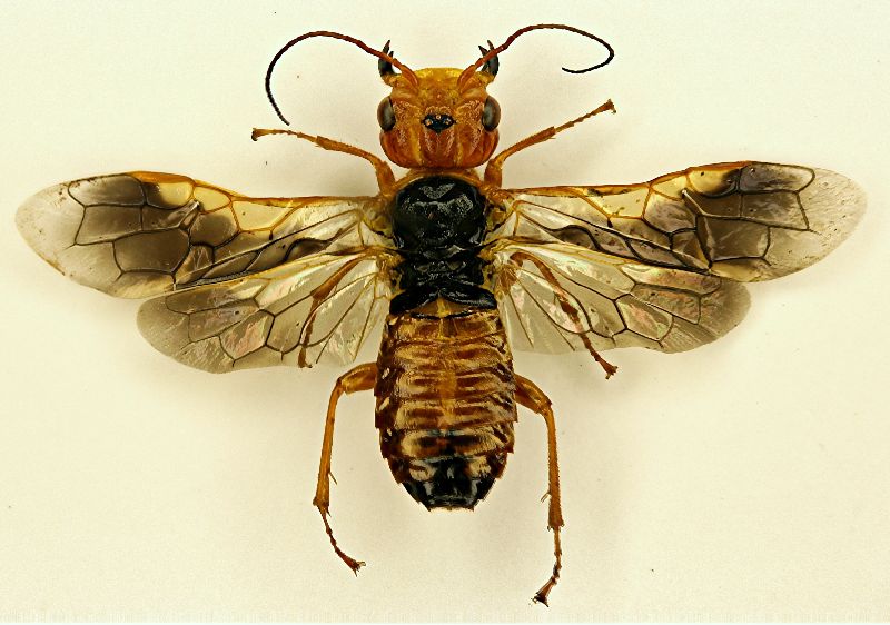 Scusate se non posso presentarvi una sua foto, ma davvero non riesco...ho chili di "roba" da preparare per sabato e pochissimo tempo a disposizione Comunque la curiosità è troppo grande per non farvi la domanda....l'insetto lo porterò con me sabato. Allora, ieri pomeriggio, mio figlio mi chiede di "andare a caccia di insetti, che è un sacco che non lo facciamo" Cosa potevo rispondere, anche se stava spiovigginando ?? Non posso mica deludere il mio pargolo Quindi si va al Talon, un grande parco della periferia ovest di Bologna davvero "notevole" con gigantesche piante di quercia, pioppo e tantissimi angolini ancora selvaggi. Nella parte più boscosa, su una foglia (credo di sambuco) trovo un grosso imenottero, cira 1.5 cm. che collego subito ai Tenthrenidi (  ), ma è l'aspetto complessivo ad essere molto peculiare: è piuttosto massiccio, addome arancio, pronoto nero e soprattutto una gigantesca testa arancione con formidabili mandibole.......che può essere ? Quelle mandibole devono essere caratteristiche e di facile attribuzione Grazie per la pazienza e salute a tutti !!