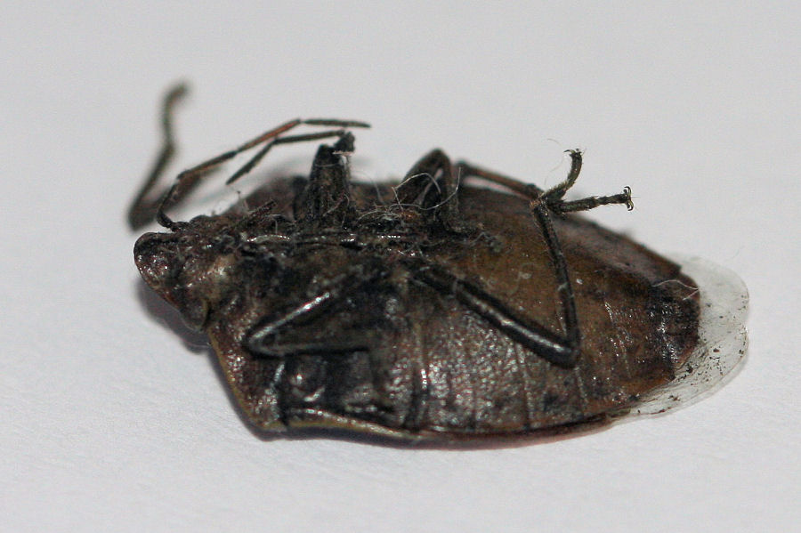 Ho trovato questo Pentatomide morto sotto la corteccia parzialmente sollevata di un ippocastano. Non riesco a capire che cosa possa essere (mi ricorda un po' Peribalus sp. - ma non credo sia lui). Mi hanno colpito le membrane più lunghe del corpo e la testa relativamente larga, inoltre appare molto piatto. Misura 12-13 mm di lunghezza e 7mm di larghezza (parte più larga del pronoto).