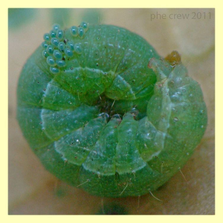 3.5.2011 dopo poche ore il bruco è completamente secco e le larve di Imenottero formano una strana ''muffa'' forse per proteggersi