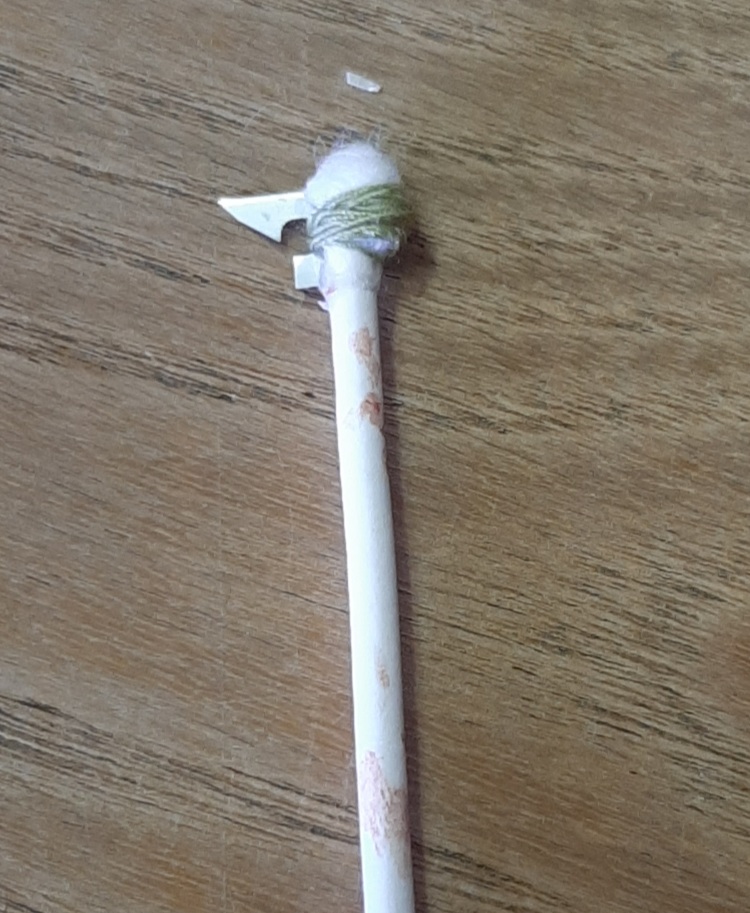 Togliendo il cotone da un cottone fioc viene fuori un piccolo bastoncino, con anche un buco all'interno dove poter fissare qualcosa, vedo se riesco con quello se no mi ingegno con un bastoncino dove incollare la lama come hai detto tu.