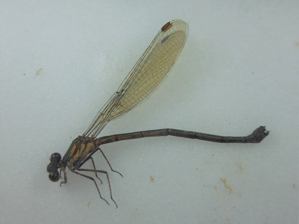 Mi ha colpito questa piccola libellula perchè in natura aveva un bel colore verde ramato, che sembra aver perso ora, per me insolito. Il corpo è lungo circa 4 cm.