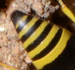Gli ultimi segmenti addominali non sono neri, ma bagnati e sporchi di fango (numerosi esemplari sguazzavano in una pozzanghera); si intravedono comunque le strisce gialle. Probabilmente ho scelto l'esemplare più sporco dei vari che ho fotografato. Aggiungo un'altra foto, fatta sulla stessa pozzanghera pochi secondi dopo, di un esemplare più pulito: il giallo degli ultimi segmenti è qui evidente.