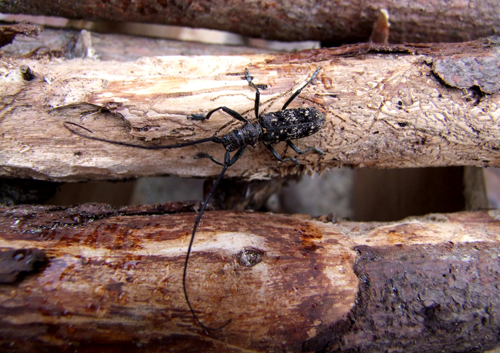 Certamente........innanzitutto questa volta i risultati sono stati assai più fortunati di quanto pensassi, ben tredici exx. di Monochamus saltuarius!! Ma diciamo del tipo di legna: ho raccolto rami spezzati, al suolo, al margine di un bosco di conifere, soprattutto abete rosso. Il legno raccolto si presentava non freschissimo, comunque molto bagnato e, sopra la corteccia, spesso con tracce evidenti di muffe biancastre, però all'interno i rami erano compatti, duri, tutt'altro che marci. Il diametro di pochi centimetri, quattro o cinque al massimo, e bastava sollevare a caso la corteccia (ma specialmente vicino alle biforcazioni) per vedere le gallerie larvali a tratti vuote e a tratti zeppe di segatura molto grossa, di color sale/pepe poichè composta di residui legnosi sia della corteccia (scura) che del legno sottostante (chiaro). Vicino al foro di ingresso della larva dentro il legno (come si vede nell'ultima foto) la segatura si fa ovviamente chiara. Ho notato che, una volta dentro il legno, certe larve hanno allestito la loggia ninfale entro due-tre centimetri, mentre altre volte le larve hanno continuato a mangiare all'interno del ramo anche per dieci-quindici centimetri. Dunque bisogna fare molta attenzione a dove si sceglie di segare il ramo....se si taglia troppo vicino al foro di ingresso della larva si corre il rischio di portarsi a casa solo un pezzo di legno con la galleria larvale e di lasciare la larva ....al suo destino!(come mi è capitato l'anno precedente!). M. saltuarius convive col galloprovincialis, e può capitare che ne escano di entrambe le specie.