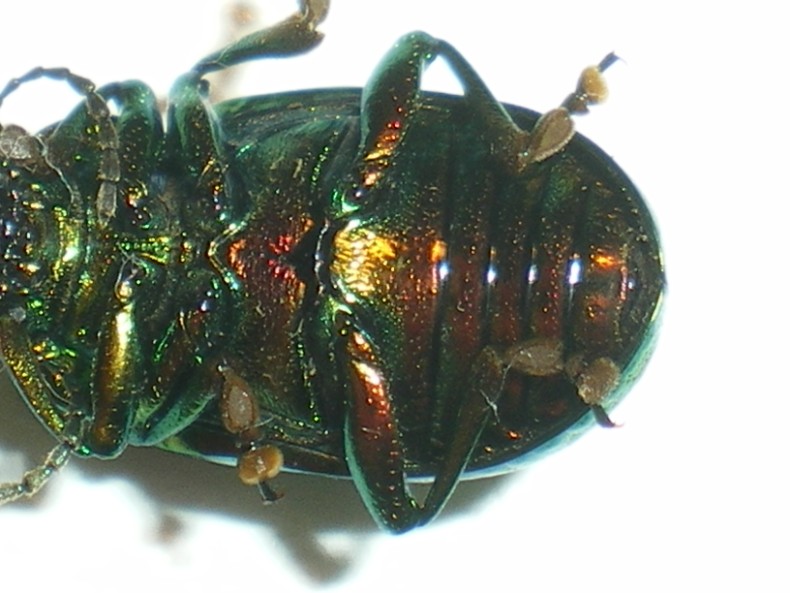 Vedi che il mio scrupolo aveva una ragione? E' una Chrysolina: lo vedi dalla diversa dimensione del metasterno (freccia rossa) rispetto al primo segmento addominale (freccia verde). Nelle Oreina sono grosso modo della stessa lunghezza.