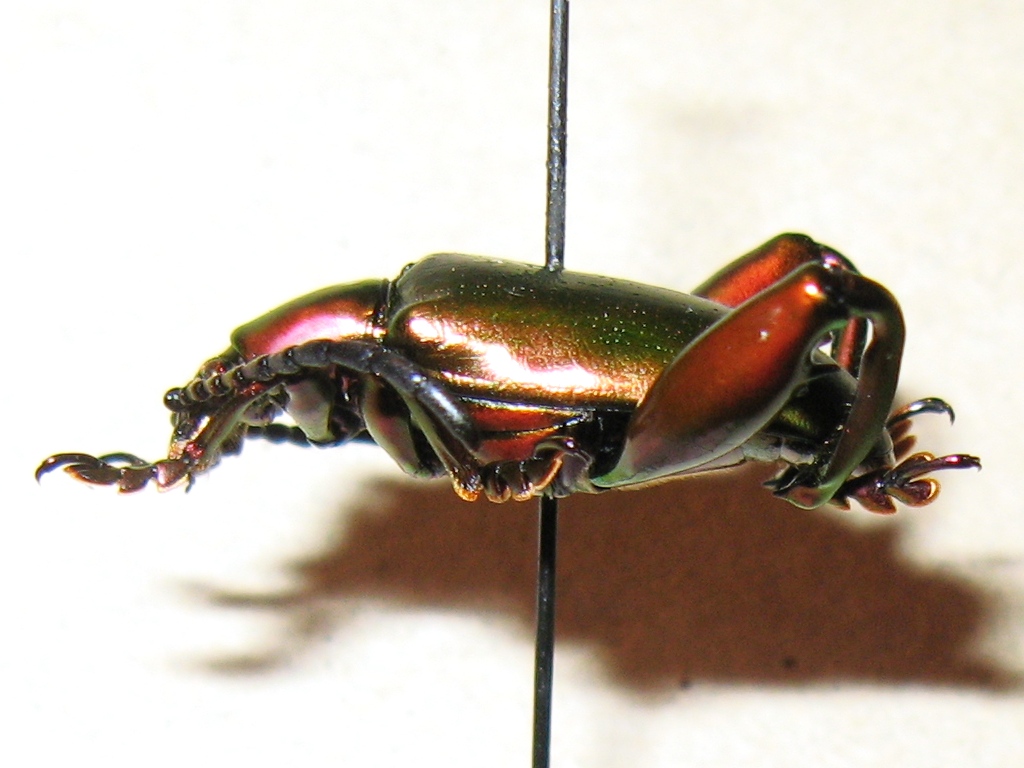 ed infine questo, decisamente più rosso, che potrebbe essere i maschio di Sagra femorata, visti i femori più articolati e la pancia pelosa. l. = 17 mm |