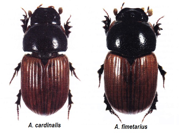Aphodius cardinalis + A. fimetarius.jpg