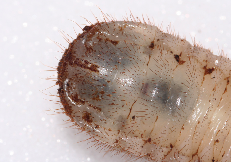 Calogero, ci servirebbe possibilmente una foto dell'ultimo segmento addominale ventrale, in particolare del raster, una struttura spiniforme disposta a file parallele che si incontronano più o meno alle estremità (anche se non c'è o è poco chiara va bene lo stesso); e se ci riesci (e se si sta ferma :mrgreen: ) un ingrandimento dell'ultimo antennomero della larva, poi la lasciamo in pace :)