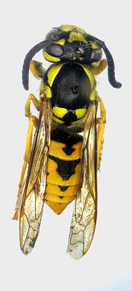 Ho fatto qualche prova con il nuovo sistema, costituito dalla lente +4 e l'obiettivo Konica montato al contrario tramite l'adattatore. Questa è una Vespula germanica di circa 10mm che mi sono ritrovato su un piano di preparazione, il risultato finale è ottenuto con 20 scatti, anche se deve esserci stata una leggera rotazione a giudicare dall'addome. Probabilmente la rotazione è dovuta alla vite che regge la slitta che si è un po' allentata, ma stretta la vite il problema dovrebbe risolversi e le foto dovrebbero venire decisamente bene.