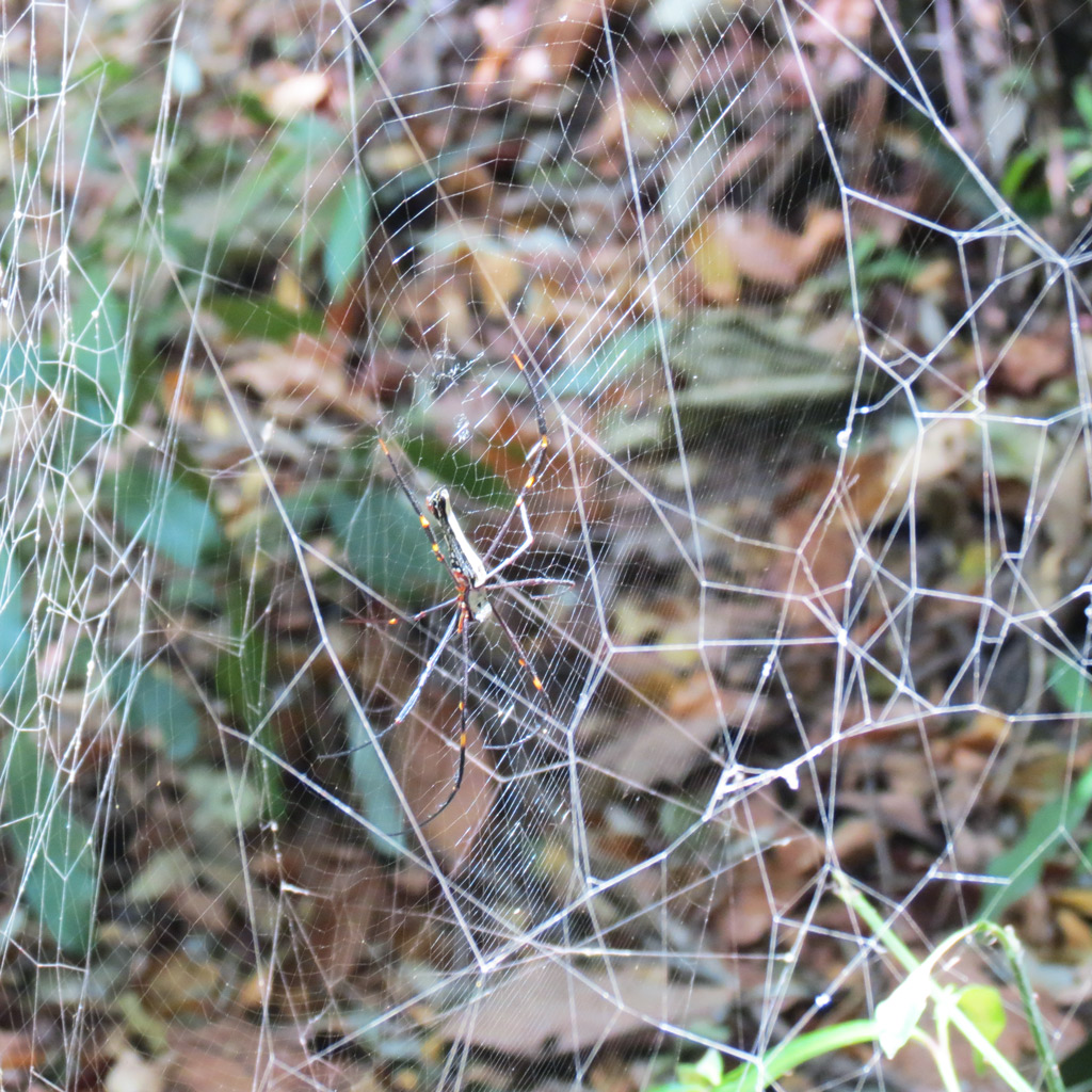 Un albero colossale all’interno della Riserva di Ritigala. Alcuni locali, interpellati, dicevano trattarsi di TELAMBU (= Sterculia foetida), ma ho qualche dubbio. Un grosso ragno sulla sua particolare ragnatela tridimensionale (un angolo diedro, in realtà, che non sono riuscito a rendere nella foto).