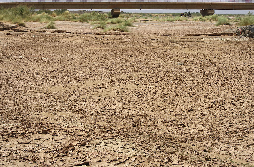 Il letto del fiume è talmente secco da aver formato una crosta tutta “crepata” di argilla.