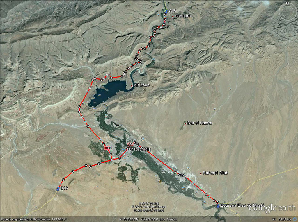 Questa mattinata mi riporta il buonumore, tanto che il pomeriggio decido di concedermi un po’ di turismo. Vado a Sud di Er-Rachidia e vado a vedere le Source Bleu du Meski, un torrente lungo il quale è stata creata una piscina dove si riversano i giovani della zona a rinfrescarsi; mi dicono che si chiama così perché nell’antichità una carovana di tuareg si era fermata nel palmeto; un giovane di loro era andato verso la sorgente per prendere acqua e così facendo le sue vesti erano finite in acqua tingendola di indaco, così da allora è stata chiamata la sorgente blu del Meski (che è il torrente).