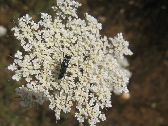Il mio obbiettivo primario era quello di porre due trappole aeree con vino come anticipato in questa discussione ( viewtopic.php?f=342&t=54743). Fatto ciò, comincio a esplorare i dintorni; i primi coleotteri che trovo sono una femmina di Trichodes leucopsideus, specie non comune e localizzata in Sicilia, che mi scappa  e un maschio di Chlorophorus sartor (O. F. Müller, 1766), che avevo precedentemente trovato solo a Montalbano Elicona. Di questa specie oggi ho invece visto molti esemplari su Daucus carota, alcuni in copula: