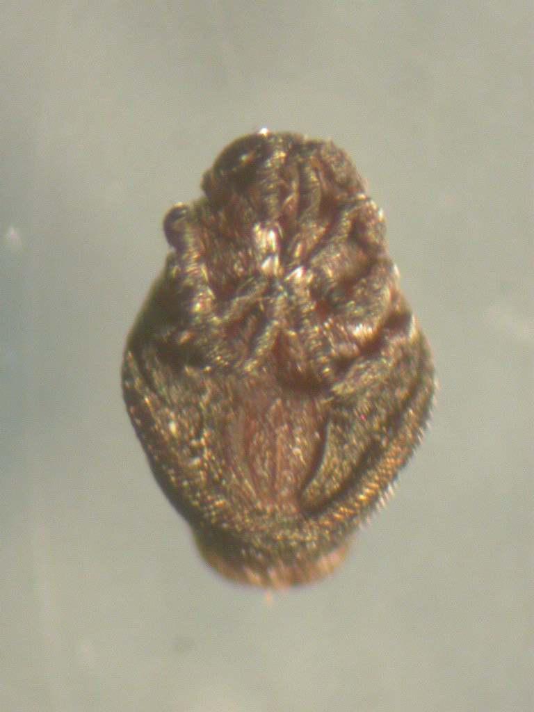 Guardando un piccolo allevamento di xilofagi, lungo il bordo dell'elastico che tiene ferma una reticella, ho notato un 'microbo' lungo appena 1 mm. L'ho fotografato sotto lo stereo, non so di cosa si possa trattare.