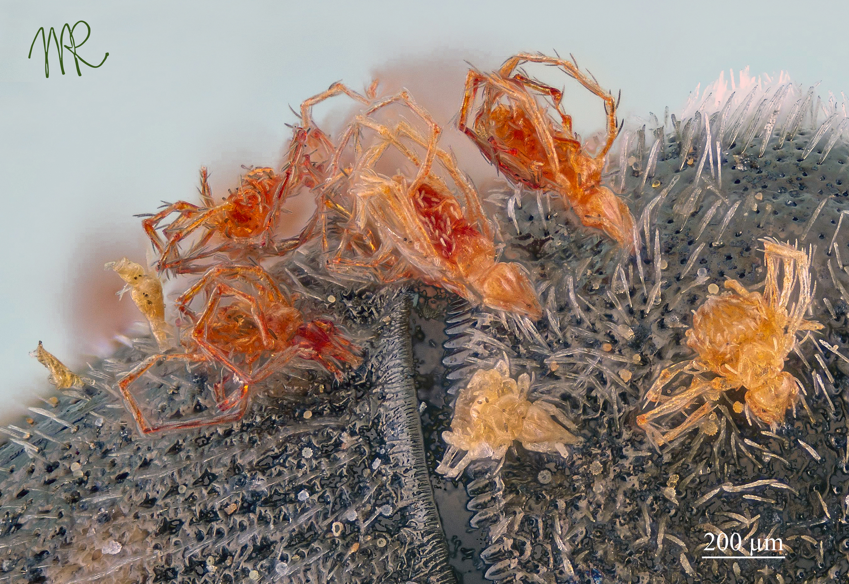 Gli acari sono larve parassite di Erythraeide. Guardando la struttura dello gnatosoma sembrerebbe una specie di Leptus come questa, uno dei generi più comuni.