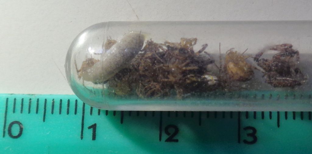 Oggi, su richiesta di un amico, dovrei identificare le due specie di ragni di una singola celletta costruita tra due vetri di una finestra. Esiste anche una foto di un adulto dello sfecide, ma è in controluce e non si vedono i reali colori (solo nero), e non si desumono dimensioni, anche se pare si tratti di un Chalybion sp., probabilmente il bengalense ma possibile anche il femoratum. Lo spessore delle pareti della celletta farebbe escludere a mio avviso Sceliphron curvatum e per quanto mi è noto la preferenza delle prede è pure per esso di Araneidae [/i]spp. mentre qui di esemplari ad essi simili ve ne sono solo due (Larinioides sp.?), uno dei quali reca una larvetta dello sfecide che pare tuttora viva e che proverò ad allevare. Gli altri mi paiono di famiglia diversa. Grazie di ogni ID.
