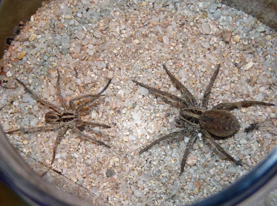 Ciao Marco. Come ti ha detto Luigi si tratta di Hogna radiata, un gran bel Lycosidae. Stando ai palpi sembrerebbero due femmine, i maschi adulti hanno infatti i palpi trasformati in bulbi necessari alla copula, quindi con all'estremità una struttura rigonfia facilmente notabile. Quello che non ci hai detto sono le dimensioni del corpo, ma stando alla taglia della pupa di T.molitor credo siano entrambe femmine senza troppi dubbi.