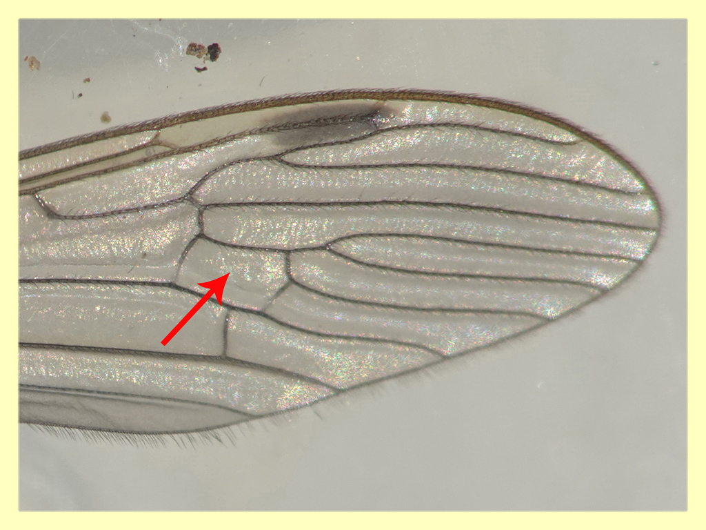 6b) vena M-CU oltre la base della cellula discale. Ala spesso senza aloni, disegni, macchie.