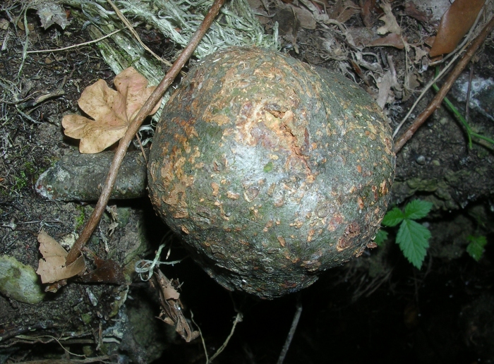 Per la galla su radice, non è facile dire le dimensioni a memoria... erano circa quelle di un pugno. Ma nel caso di questa galla legnosa sarà facile rintracciarla e dirti poi con più precisione