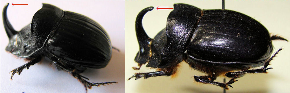 I agree with the Maurizios, Zdeno and Adrian: there are two different species. The female with the horn bifurcate apically – and pronotal angles rounded - is not C. hispanus. It should be C. lunaris.