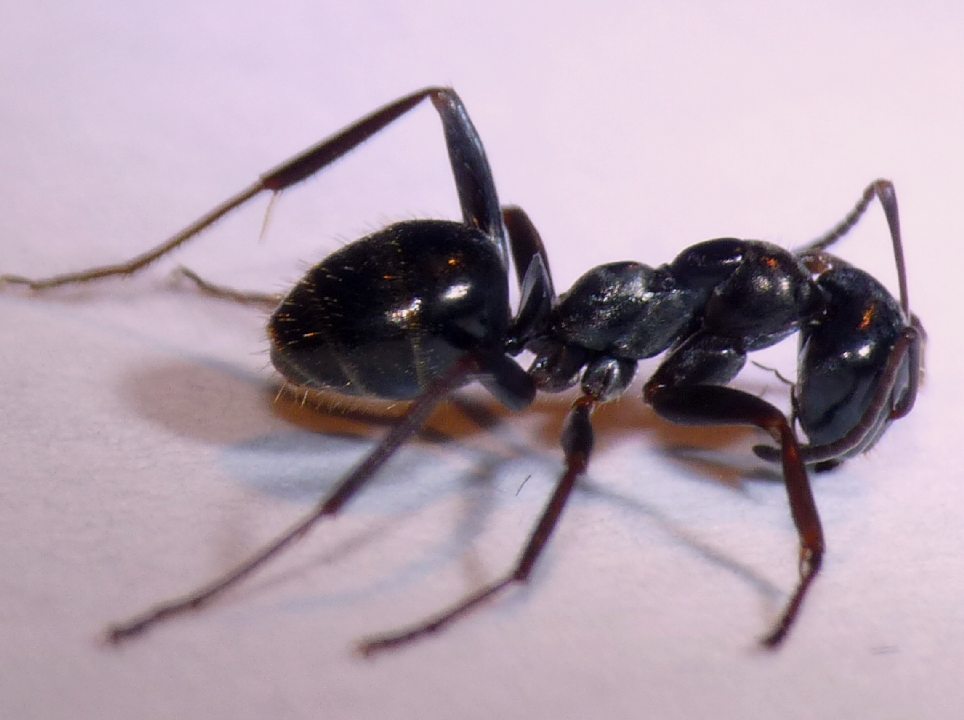 A giudicare dalla struttura il genere mi sembra Formica, ma non ne avevo mai incontrate completamente nere; di solito sono grigie o rossicce. Inoltre, non vedo ocelli.