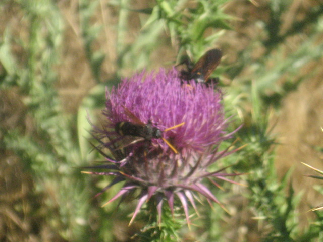 Un' altra scena curiosa: un tentato accoppiamento fra un maschio di Megascolia bidens (Linnaeus, 1767) - Scoliidae e una femmina di Megascolia maculata flavifrons (Fabricius, 1775) - Scoliidae: lei, intenta a nutrirsi, non ne ha voluto sapere e ha subito cacciato il maschio importunante.