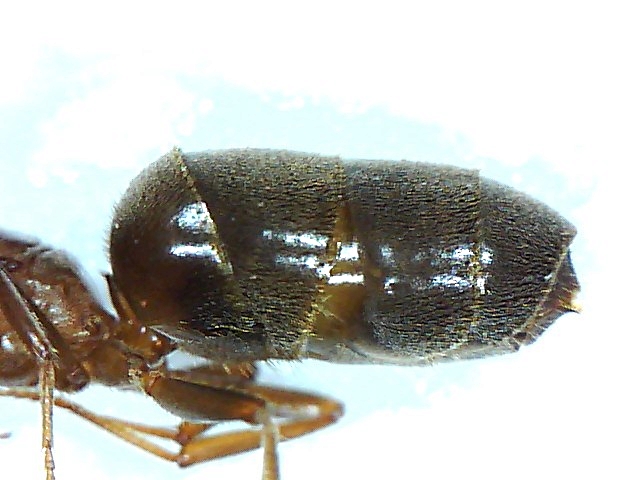E’ la regina del Lasius emarginatus. Il carattere che ci restringe molto il campo è la peluria eretta, non pettinata, sugli scapi. Si vede bene, ma non distintamente sullo scapo sinistro nella prima foto. Il campo è ristretto quindi solo a 3 specie autoctone di Lasius s.str.: il niger, il platythorax e l’emarginatus. I primi due hanno regine uniformemente scure, la regina del Lasius emarginatus ha invece il torace più rossiccio, uniformemente al carattere delle operaie. :)