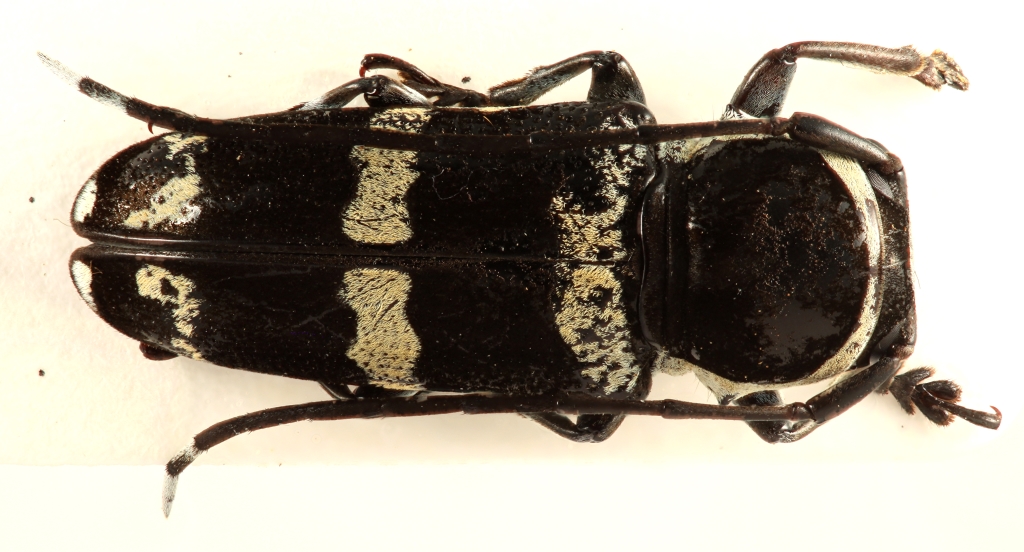 nigris; elytris cinereis nigro-conspersis, fascia angusta angulata