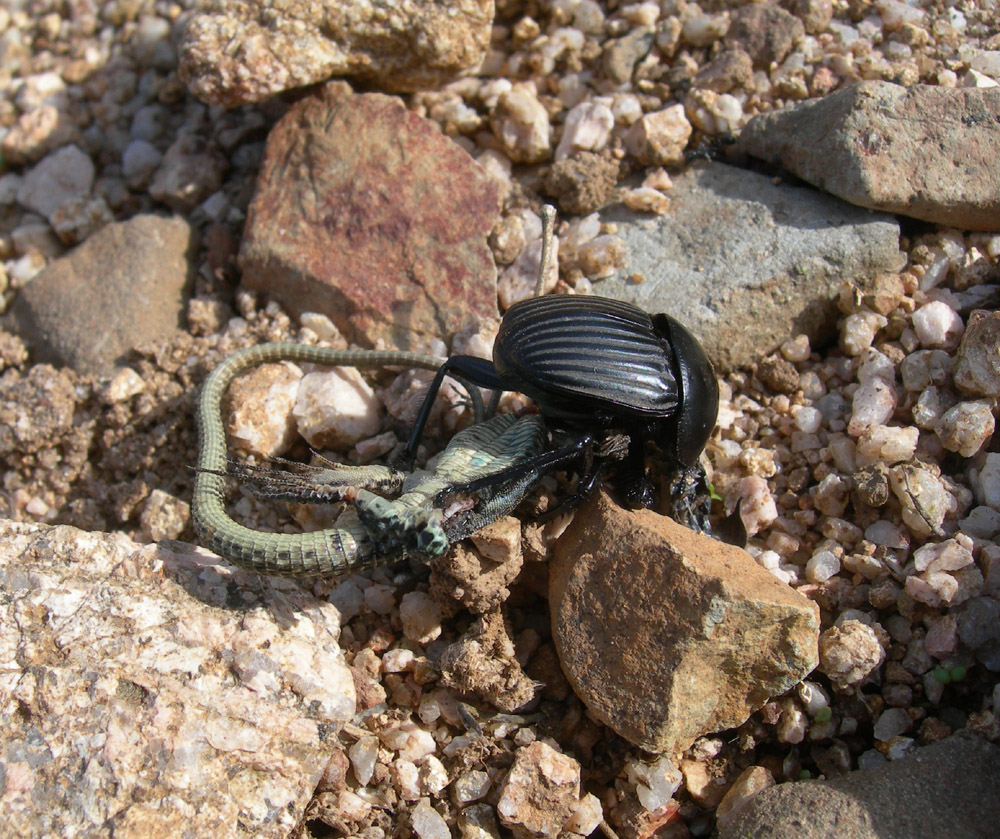 Questo Ateuchetus laticollis (Linnaeus, 1767) voleva a tutti i costi appallottolare il cadavere della lucertola (Podarcis tiliguerta) per portarsela via.