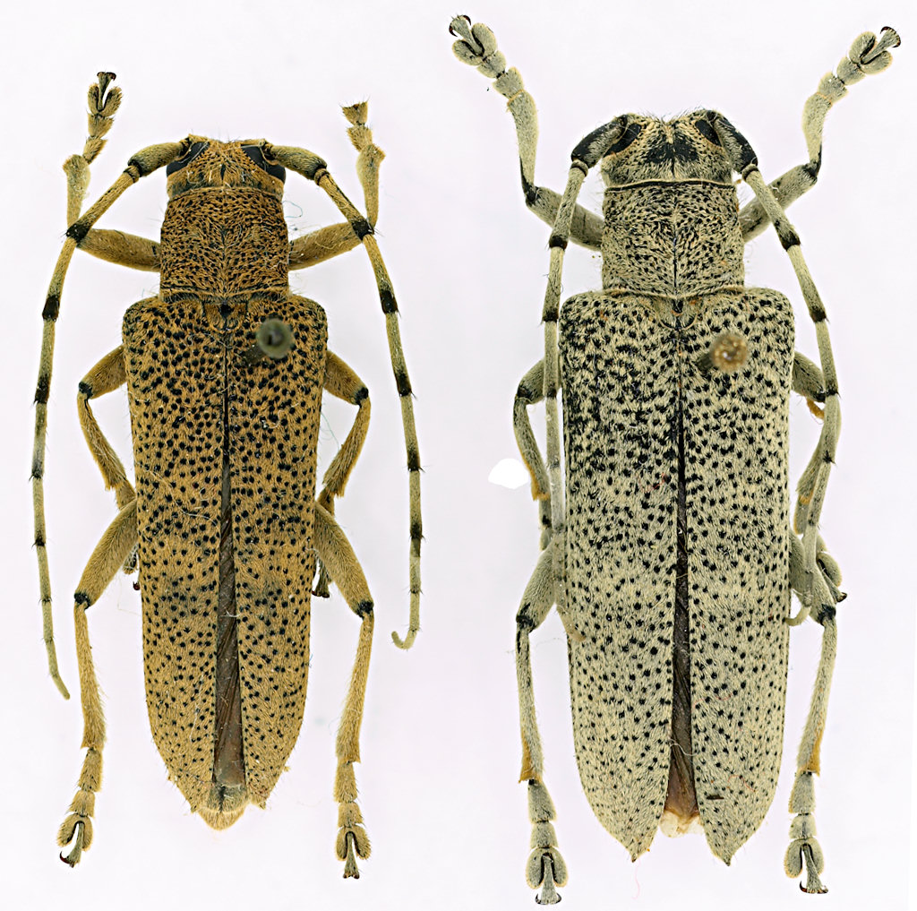 Grazie Maurizio, la differenza è proprio quella. Il 90% degli esemplari (tranne 2) che conosco dell'Italia, dalla Romagna (inclusa) in giù, sono grigi, mentre quelli centro europei sono tutti come il tuo maschio. Da notare che anch'io ho due esemplari brunastri, uno di Romagna e uno del Lazio, entrambi maschi. Solo una curiosità statistica da approfondire. Come le popolazioni appenniniche di Rosalia alpina (tutte sexmaculata), quelle di Rhagium inquisitor con maschi sempre molto più chiari di quelli alpini o centro europei, quelli di Rhagium bifasciatum con maschi sempre "unifasciatum", ecc.