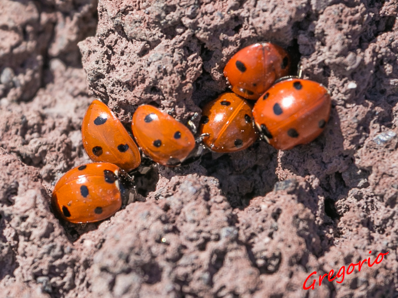 Ciao Gregorio. Coccinella (Coccinella) septempunctata septempunctata Linnaeus, 1758 Il rinvenimento di questa specie sull'Etna, in gruppi spesso numerosi sotto le pietre laviche, non è nuovo. Cito testualmente da Baviera, 2004: I° CONTRIBUTO ALLA REVISIONE DELLA COLLEZIONE COLEOTTEROLOGICA DI FRANCESCO VITALE: COLEOPTERA COCCINELLIDAE VITALE (1905) indica questa specie come quella più comunemente rinvenibile in Sicilia “ovunque ed in tutti i mesi”. Segnala in particolare il rinvenimento di moltissimi esemplari sulla cima dell’Etna: “Ricordiamo che in una gita sull’Etna nel 1878, ne trovammo una quantità straordinaria, alla sommità del vulcano, lontano da qualsiasi vegetazione, aggrappata ai blocchi di lava”. Io stesso l'ho incontrata così una volta nei dintorni del Rifugio Sapienza.