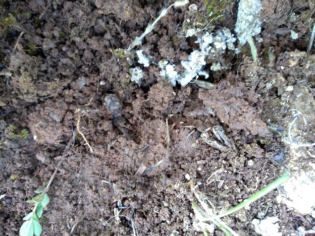 Tra carpini, olmi, pungitopo e qualche castagno il sentiero serpeggia costeggiando l’alveo disseccato di un profondo torrente. Proviamo a scendere sul fondo di quest’ultimo ma, a parte qualche Eterottero subcorticicolo, non c’è moltissimo, e per di più lì giù fa un certo freddino! Gradualmente i carpini vengono sostituiti dalle querce e dagli orni e le rocce ignee si mischiano a quelle calcaree. Lungo il tracciato rinveniamo diversi escrementi (che puntualmente mi sono dimenticato di fotografare) sia di uccelli che di piccoli mammiferi, colmi di resti di una bestiola ben nota: Calosoma inquisitor. Mi è capitato più volte di trovare questo bel Carabide in questa zona e in un’occasione esso era presente in quantità considerevoli assieme a chili di bruchi che rodevano le piante circostanti, secondo un fenomeno ben riportato e descritto dal nostro Silvano Biondi e da Roberto Battiston in questo interessante articolo. Le (o i?) Calosoma però le/li manchiamo di poco perché, nonostante il voltare sassi e cercare nel sottobosco, oltre ai resti di loro non c’è traccia. In compenso sul corniolo Nicolai becca qualche cetonia e io, in copula su una foglia, un paio di bei Cerambicidi ( Ropalopus o simili). Un po’ riluttanti ad abbandonare l’ombra del sentiero – inizia in effetti a fare un certo caldo – sbuchiamo davanti all’allevamento di capre. Le padrone di casa non ci sono e noi due, armati di professionali bastoncini, ci diamo al saccheggio dei loro rifiuti metabolici. Il fresco profumo di certi sambuchi dai fiori candidi ed abbondanti copre – un po' a stento – l’odor de cavron che aleggia a rasoterra; velocemente dal pabulum caprino sbucano fuori, oltre ai copiosi O. lemur, altri O. ovatus e taurus, un Euoniticellus fulvus e qualche Afodiino, tra cui – mi pare, ma devo ancora controllare – il mio primo Aphodius foetidus. Soddisfatti, ci dirigiamo ora verso la parte più interessante del percorso.