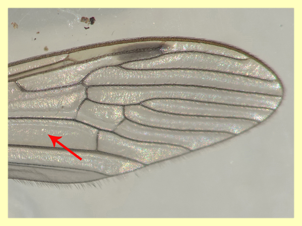 6b) vena M-CU oltre la base della cellula discale. Ala spesso senza aloni, disegni, macchie.
