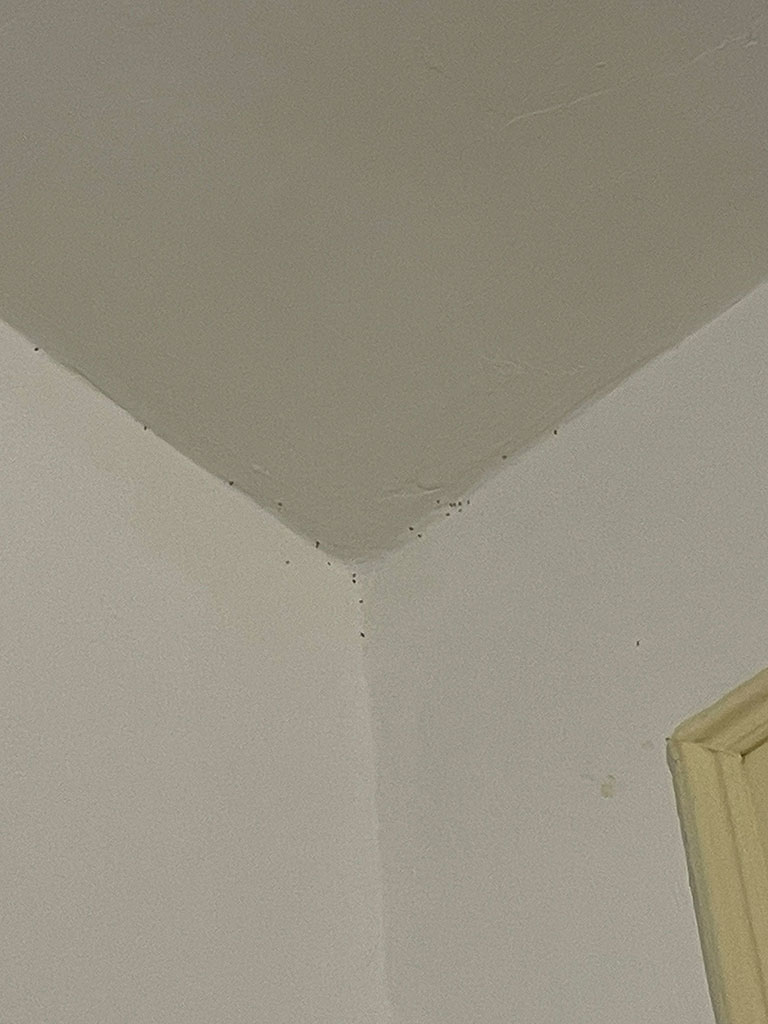 A partire dal crepuscolo, gli angoli del soffitto di alcune stanze si riempiono di agglomerati di strani insetti simili a minuscoli moscerini, che suppongo entrare dalle finestre aperte (anche a luci spente), che non sembrano essere attratti dalle fonti luminose e si muovono, o con piccoli voli o soprattutto camminando molto rapidamente, principalmente lungo le fughe tra muro e soffitto.